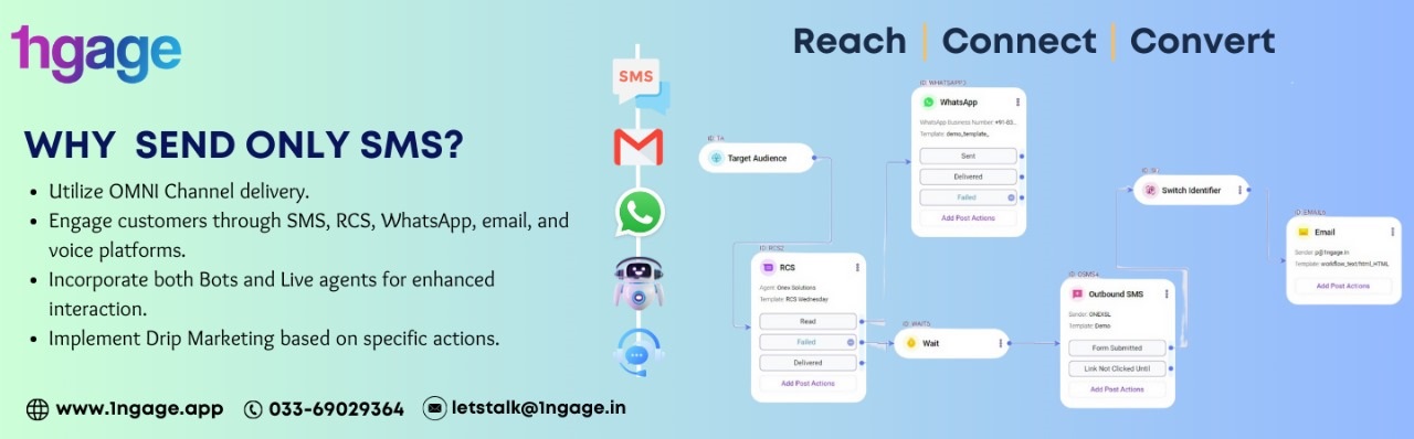 Connect Customer via Omni Channels like RCS, WhatsApp, SMS, Email, Bot & Live Agent along with Drip Marketing with 1ngage – a product by Onex Solutions