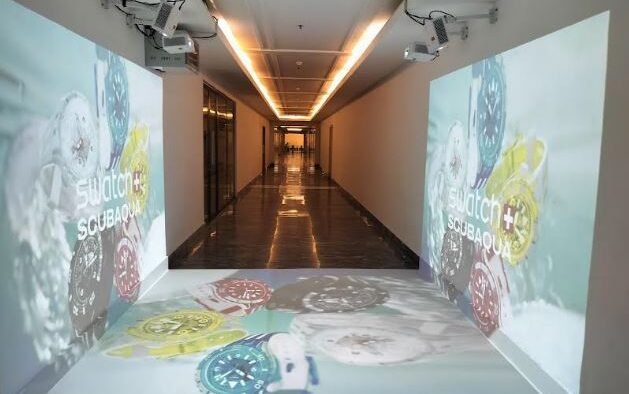 The lift lobbies of the commercial hub are showcasing the ‘Scubaqua Collection’ using dynamic cutting-edge projection mapping technology, by installing multiple short-throw projectors and transforming the lift lobbies of DLF Cyber hub buildings into a vibrant ‘Scubaqua’ world. Swatch Scubaqua Creative